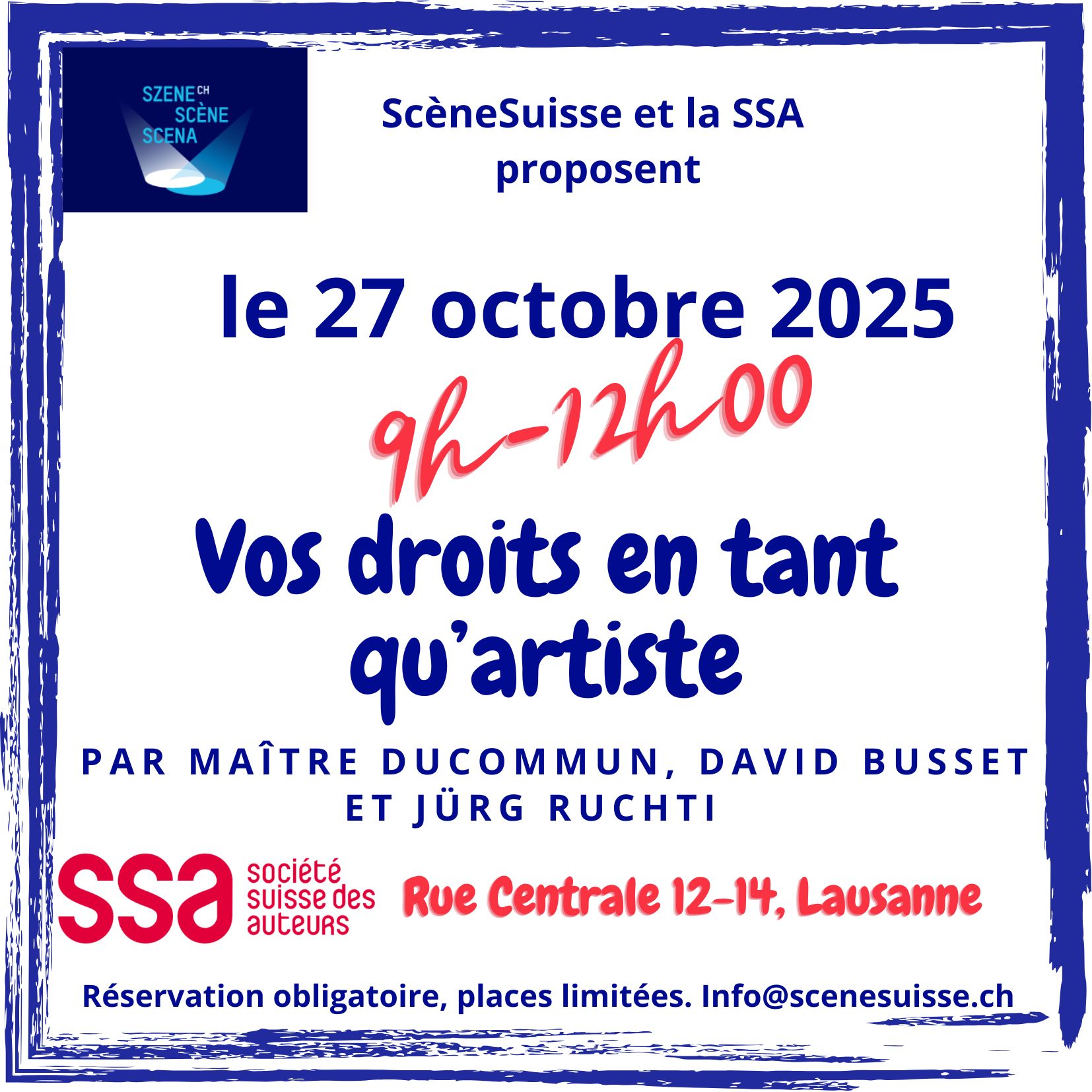 Annonceur Scène Suisse et la SSA Date de publication 13.10.2025 Domaine Artistique Catégorie Communiqué En lien CAS en Recherche de provenance 28.10.25 Unine Résidence artistique "Jean Tinguely" à Paris 21.10.25 État de Fribourg Dispositifs de durabilité dans la culture 21.10.25 Observatoire romand de la culture Toutes les actualités